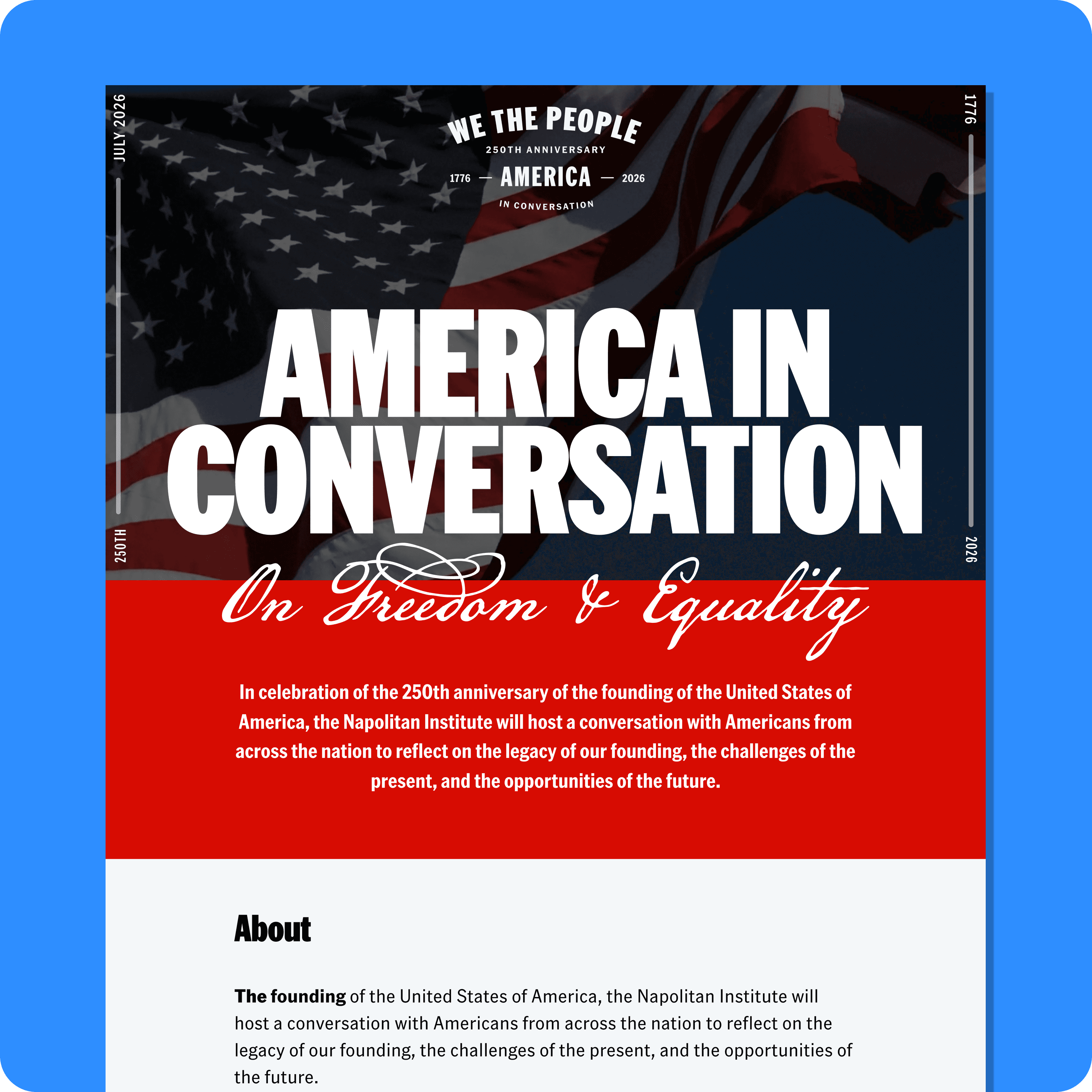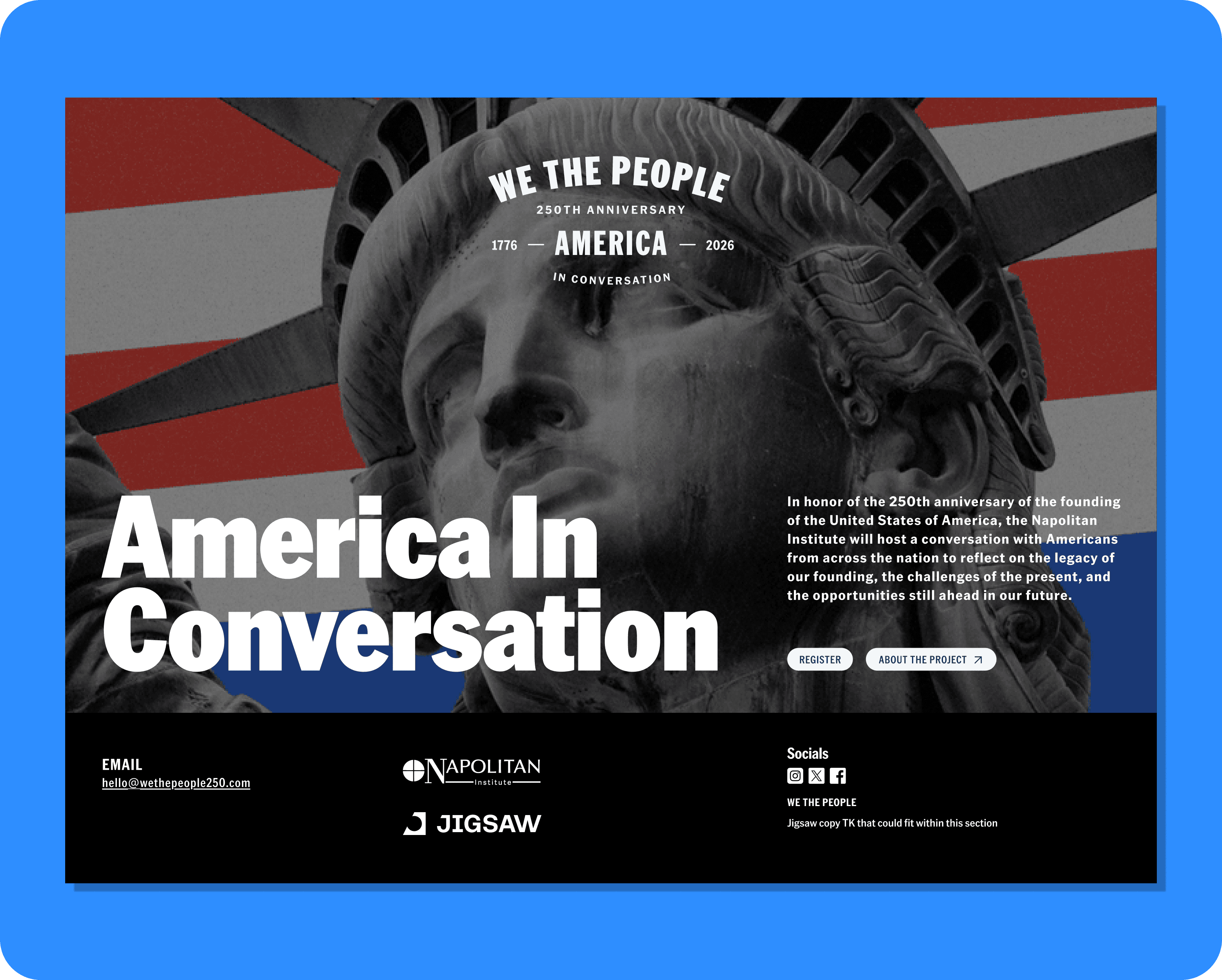 As we approach the 250th Anniversary of the United States, Jigsaw and The Napolitan Institute have partnered to create the nation's first large-scale conversation on freedom and equality, We The People 250 (live website is not reflective of the design direction seen within this project.)